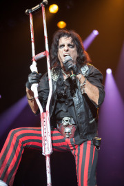 Alice Cooper begann mit seinem Set um 9 Uhr, als endlich die Lichter ausgingen und das geniale Instrumental „The underture", ein Medley aus seinen „Welcome to my nightmare"- und „Welcome 2 my nightmare" – Alben eingespielt wurde, während sich die Band hinter dem Vorhang positionierte. Als der Vorhang dann endlich von der Decke fiel, wurde der erste Klassiker „Hello Hooray" vom besten Cooper-Album „Billion dollar babies" gespielt und kurz darauf erschien der Meister in knallrotem Outfit auf der Bühne, frenetisch bejubelt vom Publikum. Und spätestens da war schon klar, dass uns ein toller Abend bevorstehen würde: der Sound war glasklar und auch nicht zu laut, die Bühne liebevoll dekoriert, die Band sichtlich gut gelaunt und Alice Cooper in Bestform. Auch seine Stimme war an diesem Abend top!