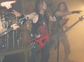 Die Brasilianer hatten von der ersten Sekunde an das Publikum voll im Griff und zelebrierten Highspeed-Death Metal vom allerfeinsten! Was hier in den 50 Minuten geboten wurde, ließ bei den Anwesenden die Kinnlade nach unten klappen, denn die Band präsentierte sich in Topform und wirklich ultratight – jede Blastsalve saß wie die Faust aufs Auge und gerade der Drummer schien nicht von dieser Welt zu sein – wie schweißtreibend sein Job war, sah man am Ende des Sets, als er sich von seinem Thron erhob und den Fans danken wollte; sämtliche Klamotten waren nur noch nasse Fetzen. Aber kein Wunder bei dieser Vorstellung. KRISIUN sind auch so unheimlich sympathische Jungs und gesellten sich nach der Show noch unters Publikum, um mit dem Einen oder Anderen ein Schwätzchen zu halten – Fannähe pur! Doch auch auf der Bühne bedankte sich die Band mehrfach beim Publikum, was wiederum gut ankam. Die gespielten Songs selber sind die pure Brachialität und KRISIUN sind als Musiker dermaßen gereift, dass es heutzutage kaum Bands gibt, die es in dieser Hinsicht mit ihnen aufnehmen können. Das jahrelange Touren trägt nun Früchte und auch dazu bei, dass eine solche Vorstellung überhaupt möglich war. Die gesamte Spielzeit über gab es Death Metal, wie er härter und brachialer gar nicht sein könnte und so tight vorgetragen, dass man diesen Auftritt schon als eine Lehrstunde bezeichnen muss. Auch vom kommenden neuen Album der Brasilianer wurde ein Song gespielt (den Namen habe ich leider vergessen), der ebenfalls aufhorchen ließ. Für mich waren KRISIUN die absoluten Gewinner des Abends, ein wirklich überzeugender Auftritt.