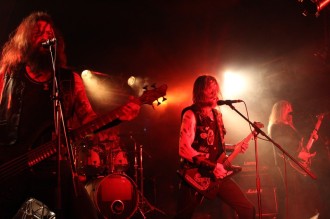 Als EREB ALTOR pünktlich um 20 Uhr die ebenfalls überschaubare Bühne betraten, waren anfangs maximal 50 bis 70 Nasen vor Ort. Die Band startete gleich mit dem Opener „The gathering of witches“ vom noch aktuellem Werk „Gastrike“ und passend zum eher Black Metal lastigen Songmaterial präsentierten sich die Jungs mit Kriegsbemalung. Wie nicht anders zu erwarten mimte Crister alias „Mats“ den Frontmann von EREB ALTOR und ging besonders beherzt zur Sache – man merkte ihm sofort an, wie wichtig ihm diese Band ist, was auch durch aggressive Mimik und leidenschaftliche Gestik untermauert wurde. Daniel alias „Ragnar“ war für die Hintergrundgesänge zuständig und leistete seinen Beitrag zum Gelingen des Gigs. Einzig der neue Bassist war bisher noch nicht in Erscheinung getreten, mauserte sich aber schnell als echter Gewinn für die Band. Er passt nicht nur optisch gut zum Trio Infernale, sondern war ebenfalls mit viel Hingabe dabei und trat auch gesanglich immer wieder in Erscheinung, vorallem wenn tiefe Growlparts an der Reihe waren. EREB ALTOR spielten an diesem Abend einen Querschnitt ihres bisherigen Schaffens und wechselten geschickt zwischen dem Black Metal lastigen, neueren Songmaterial und den epischen, Bathory-beeinflussten Songs der ersten beiden Alben ab. Nach „The gathering of witches“ kam somit ein hymnischer, epischer Song an die Reihe und meine Freude war besonders groß, als mit „By honour“ einer meiner absoluten Lieblinge und der deutlich stärkste Song des Debütalbums angekündigt wurde. Und auch live konnte der Song auf ganzer Linie überzeugen, die Band ging dermassen leidenschaftlich und souverän vor, dass mir die ganze Zeit über ein anerkennendes Grinsen ins Gesicht gezaubert wurde. Einfach nur geil!