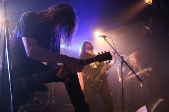 Im Anschluss daran war es erneut Zeit für einen Song aus der „Gastrike“-Phase, so dass die Band als nächstes „Dispellation“ anstimmte. Kam ebenfalls gut rüber, auch wenn ich mich schon wieder auf einen epischen Vertreter freute, schließlich wurde das Mammutwerk „The end“ bisher noch ganz ausgelassen. Doch damit war nun Schluss, denn ganz zu meiner Freude war es nun Zeit für „Balder’s fall“ und es zeigte sich, dass der Song auch live eine Macht ist und kaum epischer hätte klingen können. Ganz großes Kino. Wenn es nach mir gegangen wäre, hätte die Band auch weiterhin Songs dieser Ära spielen können, aber die Jungs blieben ihrem Schema treu und präsentierten mit „Seven“ einen weiteren, stürmischen Song der „Gastrike“-Phase, der aufgrund seiner Aggressivität ebenfalls sehr positiv vom Publikum aufgenommen wurde. Hatte die Band es am Anfang noch schwer, dass Publikum zu animieren und zum Grölen zu ermutigen, änderte sich dies im Laufe des Gigs immer mehr, so dass die Band nun nach jedem Song tosenden Beifall erntete. Doch leider war die vorgesehene Spielzeit für den Opener-Slot fast rum, so dass nur noch Zeit für einen einzigen Song blieb, der ganz zu meiner Freude wieder aus der „The end“-Phase stammte – die Band spielte zum Schluß ihres Sets mit „Myrding“ den sensationellen ersten Song nach dem atmosphärischen Intro und konnte erneut auf ganzer Linie punkten. Ein besseres Schlußlicht für den Gig hätte sich die Band nicht heraussuchen können und das sahen wohl alle Anwesenden so, denn kaum war der Song vorüber und die Band zum Abmarsch bereit, wurden die „Zugabe“-Rufe immer lauter und wollten nicht mehr abebben, man verweigerte der Band schon fast den Gang von der Bühne, so kam es einem vor. EREB ALTOR waren positiv überrascht und erfreut zugleich, dass sie als Opener-Band gleich solche Reaktionen hervorriefen und nach einer kurzen Besprechung kündigte Mats an, dass man noch einen Song zu Ehren des Meisters Quorthon spielen wird, was sofort frenetisch bejubelt wurde, vorallem weil es sich bei diesem Coversong auch noch um den Klassiker „Twilight of the gods“ handelte. Wohl keiner der Anwesenden kam bisher in den Genuss diesen Song live dargeboten zu bekommen, weshalb die Freude über diesen Coversong wirklich immens war. Quorthon wäre stolz auf seine Jünger gewesen und wenn es eine Band gibt, die den Geist Quorthons auf würdige Art und Weise am Leben erhält, dann sind es die schwedischen Landesmänner EREB ALTOR. Der Gig in Oberhausen war phänomenal und die weite Anreise locker wert.