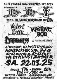 Raging Rob hatten in Düsseldorf Heimspiel. Robert Gonnella (hatte 2014 diese Band gegründet, nachdem er Assassin verlassen hat) und seine Mitstreiter boten ebenfalls geilen Thrash Metal. Der eine oder andere Song stammt noch aus Zeiten, die Robert mit Assassin durchlebte. Songs wie z.B. „Assassin“ oder auch „The Last Man“ & „Bullets“, die, die Meute vor der Bühne genauso abfeiert, wie bei den beiden Bands zuvor. Die alten Assassin Scheiben sind genauso Kult wie die Violent Force Scheibe und wurden auch nicht ohne Grund daher durch High Roller Records wiederveröffentlicht. Raging Rob spielen im nächsten Jahr 2026 wieder auf diesem Festival in Düsseldorf mit und als Überraschung konnte man hierfür noch Living Death (Sänger Toto wohnt mittlerweile in Wacken) gewinnen.